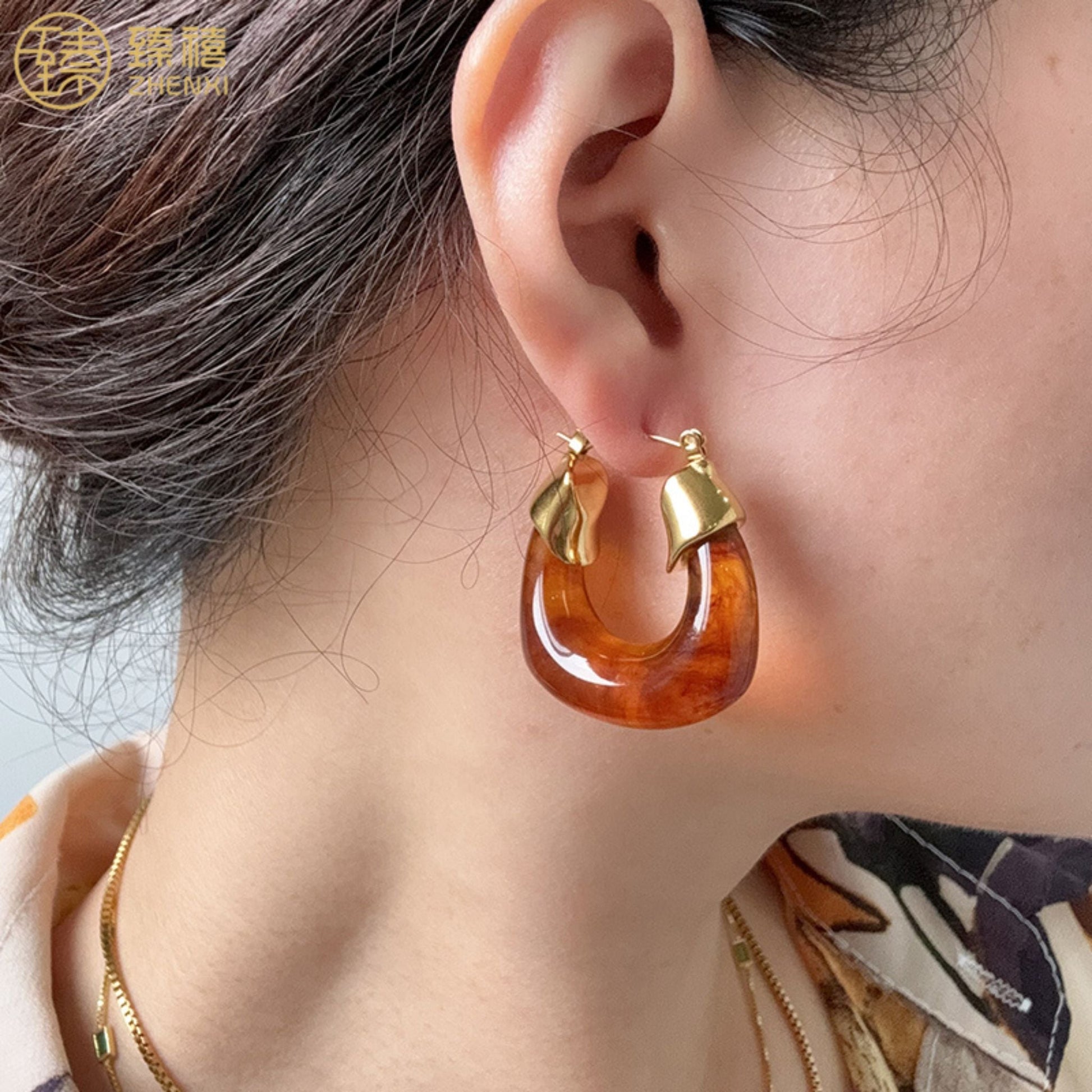 The translucent amber finish catches the light beautifully, while the gold-plated top adds a luxurious contrast. Crafted for both style and comfort, these earrings are lightweight, waterproof, and hypoallergenic, making them ideal for all-day wear—even for sensitive ears.