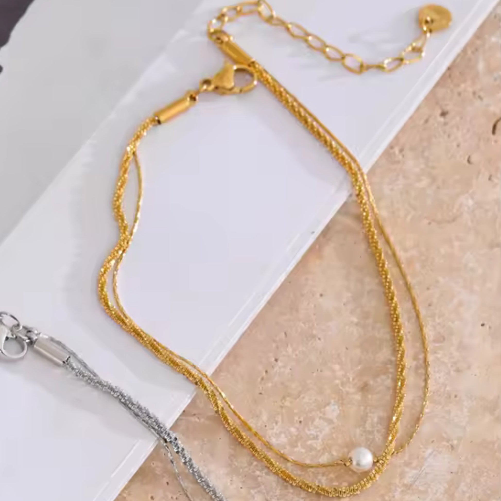 أضف لمسة من الرقي إلى مظهرك مع سوار الكاحل الذهبي الأنيق المرصع باللؤلؤ. هذه القطعة المذهلة مصنوعة من الفولاذ المقاوم للصدأ المتين ومطلية بالذهب الحقيقي الفاخر عيار 18 قيراطًا. يتميز سوار الكاحل بلؤلؤة مقلدة دقيقة تجلس برشاقة على سلسلة ذهبية مزدوجة اللون، مما يخلق تصميمًا خالدًا وأنيقًا. بطول قابل للتعديل 21 سم + 5 سم، يعدك سوار الكاحل هذا بملاءمة مريحة وآمنة لأي مناسبة.