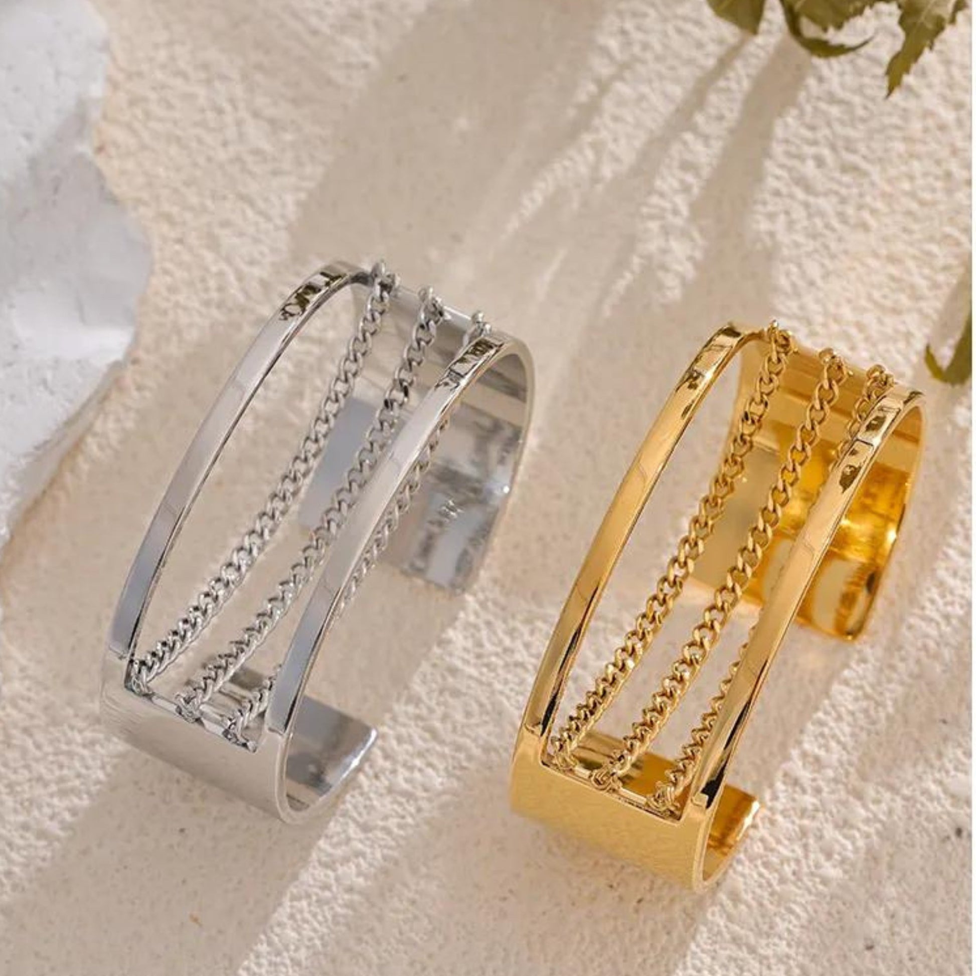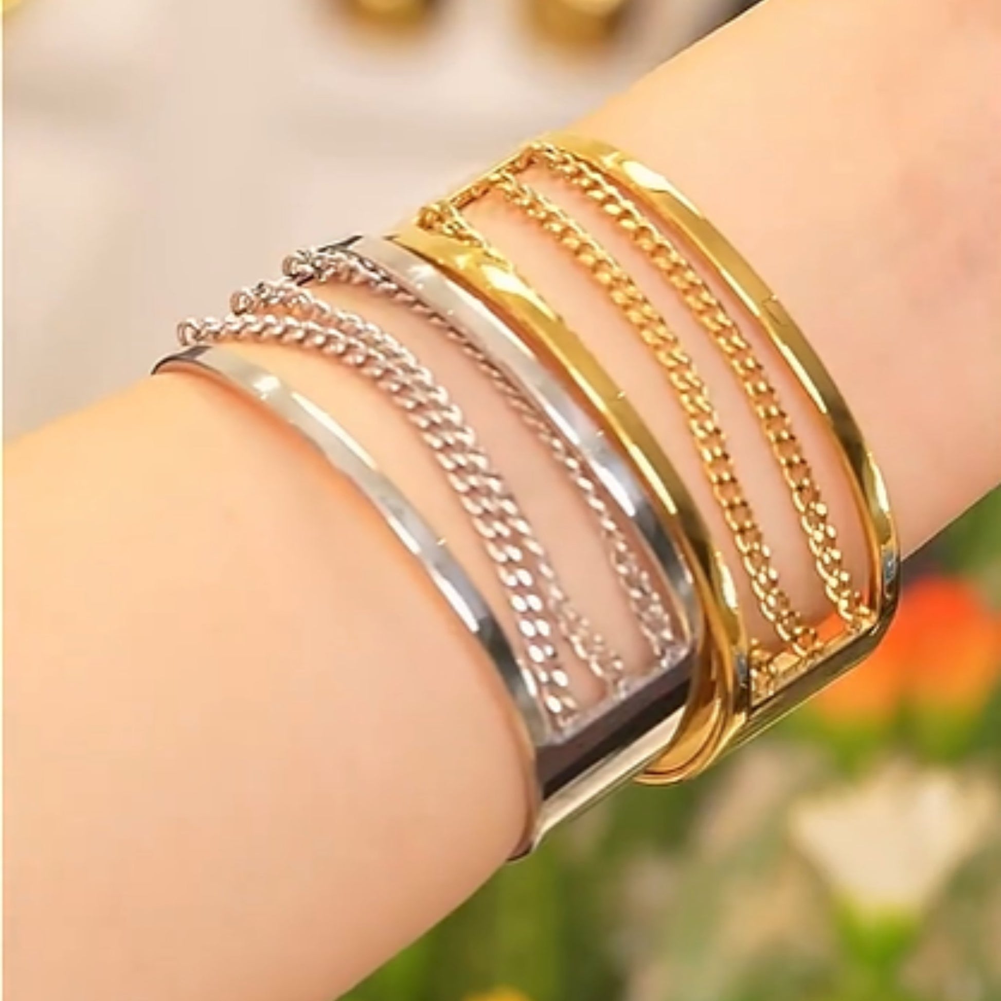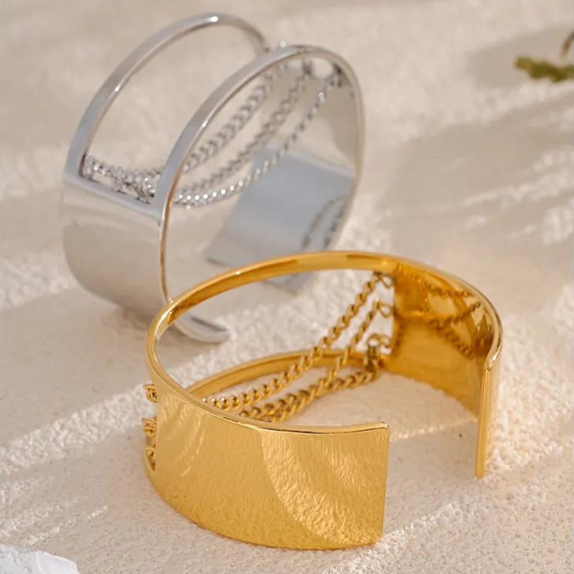 ارتقِ بمظهرك مع سوار Luxe Chain Cuff Bangle، قطعة جريئة ومتطورة تجسد الأناقة والقوة. صُمم هذا السوار بهيكل مفتوح ومزين بسلاسل معدنية أنيقة، ويضفي لمسة عصرية على أنماط الأساور التقليدية. متوفر باللون الذهبي اللامع والفضي المصقول، وهو مصنوع من الفولاذ المقاوم للصدأ عالي الجودة، مما يضمن المتانة ومقاومة التآكل.