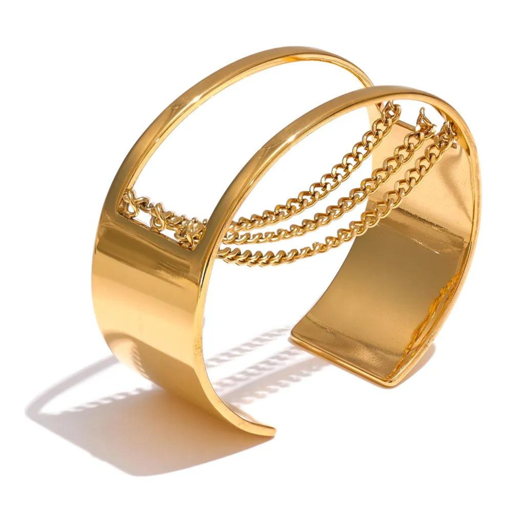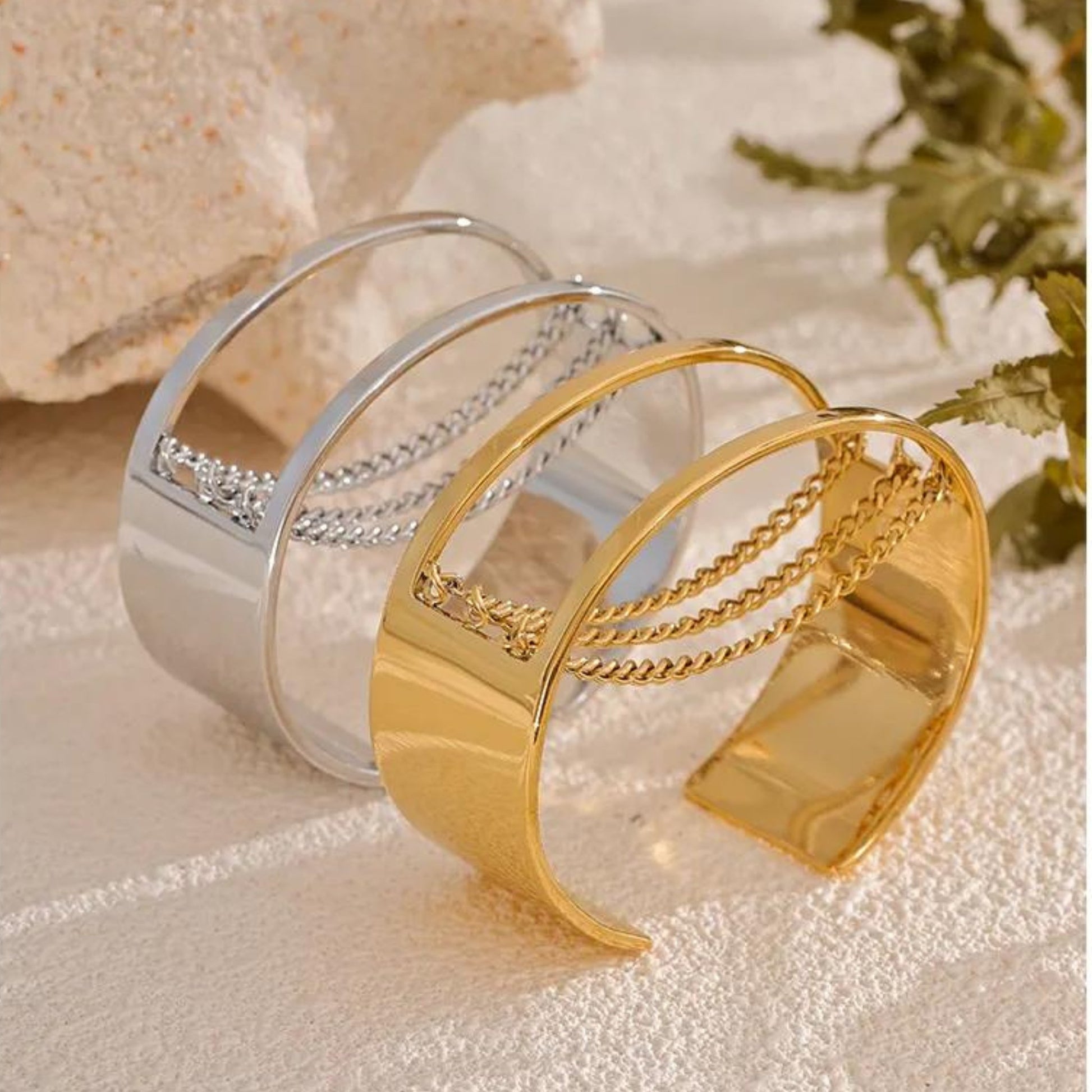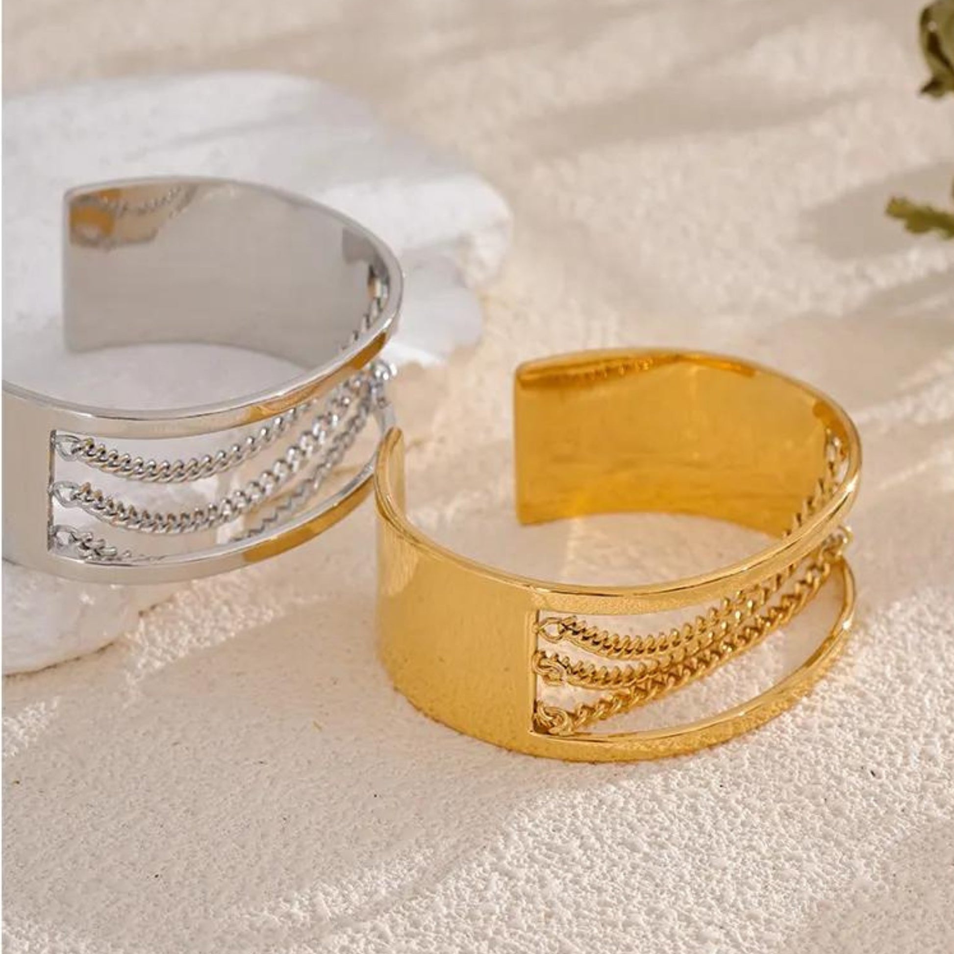 ارتقِ بمظهرك مع سوار Luxe Chain Cuff Bangle، قطعة جريئة ومتطورة تجسد الأناقة والقوة. صُمم هذا السوار بهيكل مفتوح ومزين بسلاسل معدنية أنيقة، ويضفي لمسة عصرية على أنماط الأساور التقليدية. متوفر باللون الذهبي اللامع والفضي المصقول، وهو مصنوع من الفولاذ المقاوم للصدأ عالي الجودة، مما يضمن المتانة ومقاومة التآكل.
