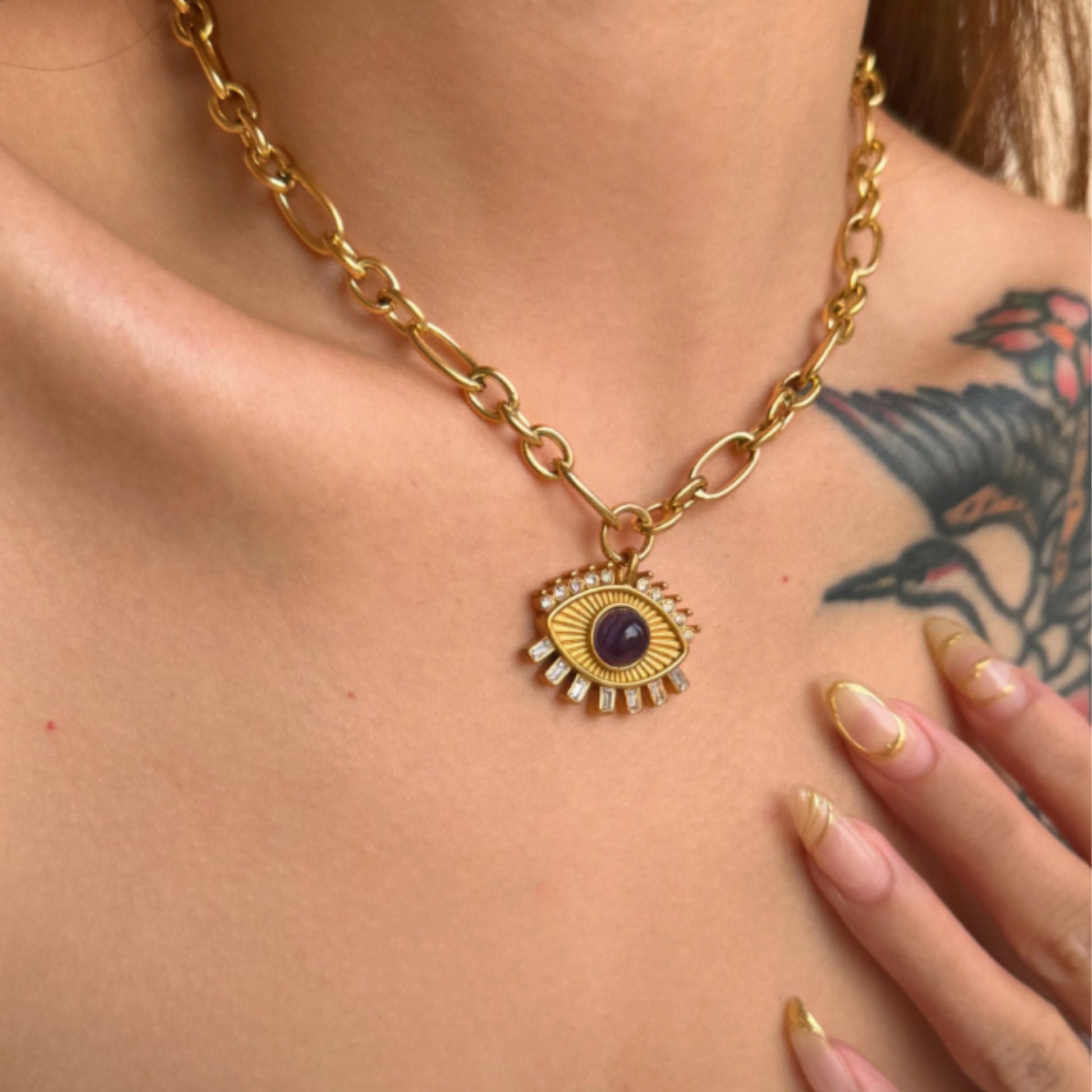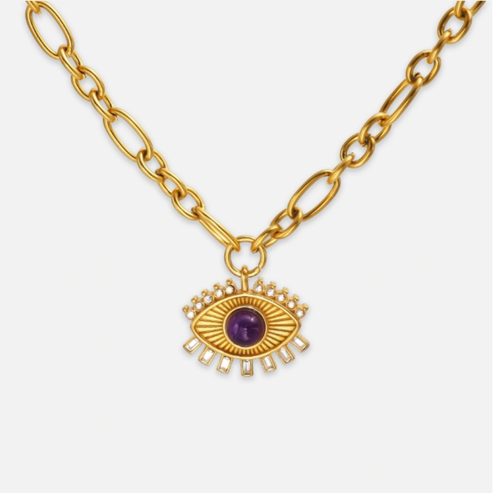 استمتعي بالغموض مع قلادة عين النبوة المرصعة بالزركون الأرجواني. مصنوعة من الفولاذ المقاوم للصدأ الفاخر ومطلية بالذهب عيار 18 قيراطًا، هذه القلادة هي قطعة مميزة تشع بالأناقة والغموض. تتميز هذه القلادة بوجود زركون أرجواني مذهل داخل قلادة عين مصممة بشكل معقد، وتجسد جوهر الجاذبية النبوية.