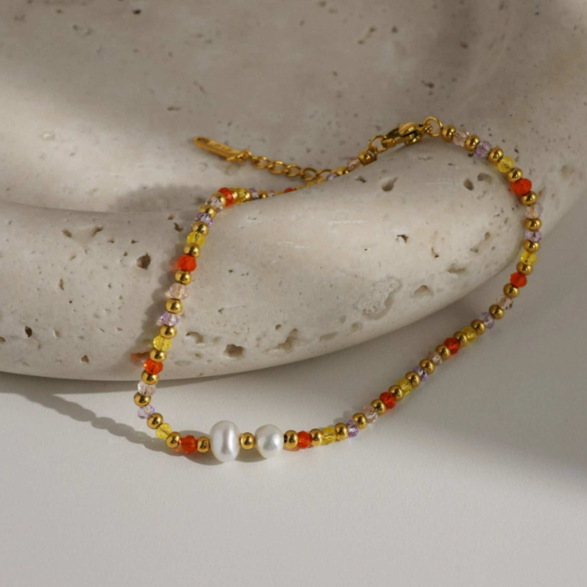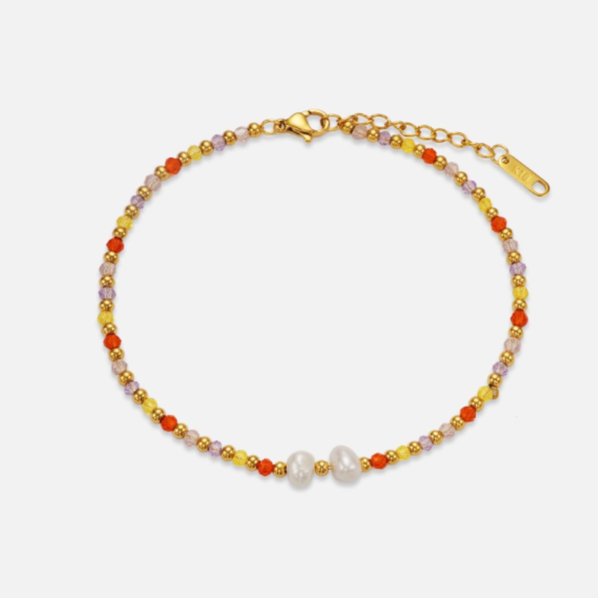 ارتقِ بأسلوبك مع سوار الكاحل المصنوع من اللؤلؤ المزين بالخرز النابض بالحياة، وهو مزيج مثالي من الأناقة والمرح. مصنوع من الفولاذ المقاوم للصدأ عالي الجودة ومطلي بالذهب عيار 18 قيراطًا، هذا السوار مزين بمجموعة ملونة من الخرز تكملها لآلئ لامعة. يبلغ مقاس سوار الكاحل 22+5 سم، مما يضمن ملاءمة مريحة مع سلسلة تمديد قابلة للتعديل تتيح لك تخصيص الطول حسب تفضيلاتك.