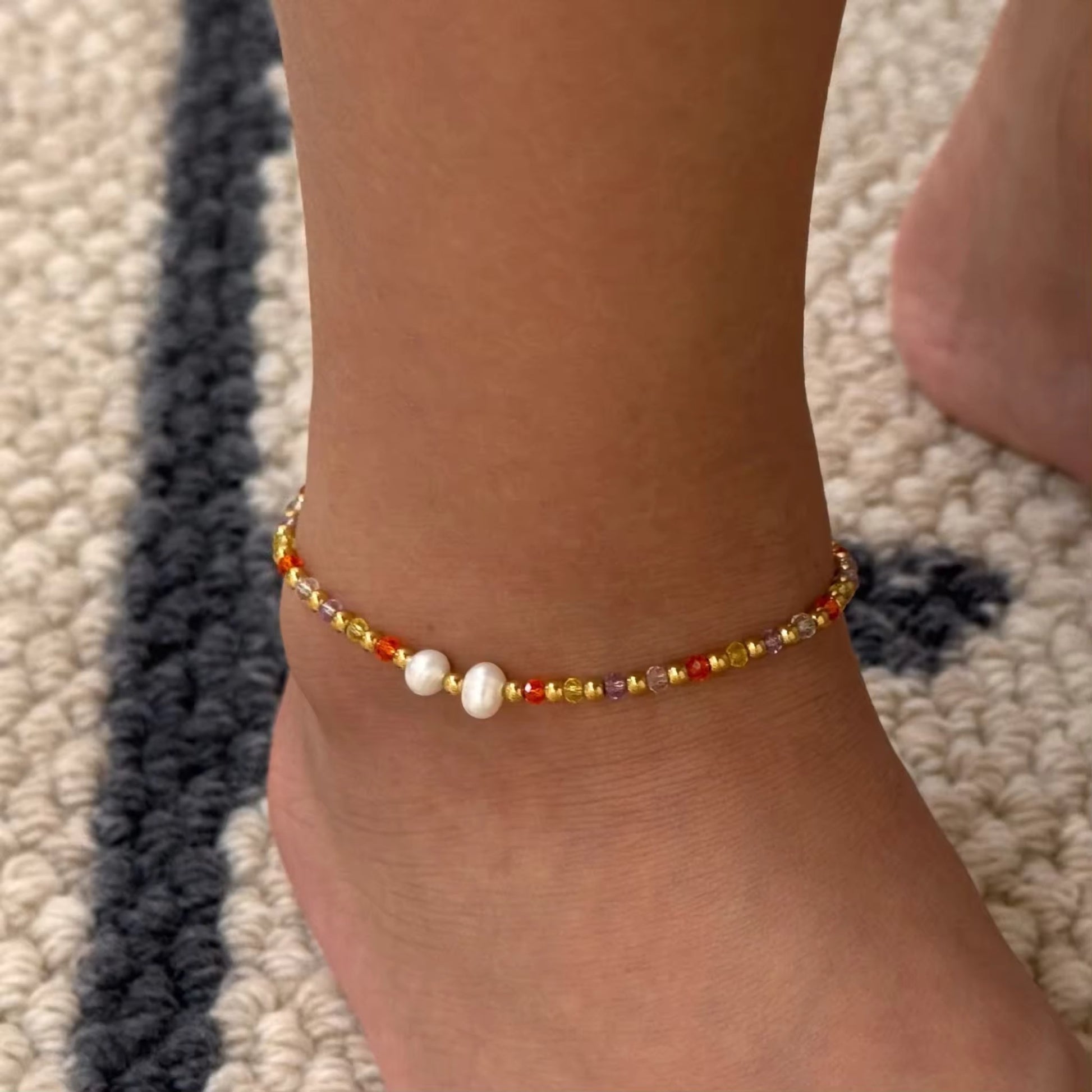 دعي كاحلك يتألق مع هذا السوار المصنوع من اللؤلؤ المتلألئ، قطعة رائعة تجمع بين أناقة اللؤلؤ ومتعة الخرز الملون. سواء كنت ترتدين ملابس رسمية أو غير رسمية، فإن هذا السوار يضفي لمسة ساحرة على أي زي.