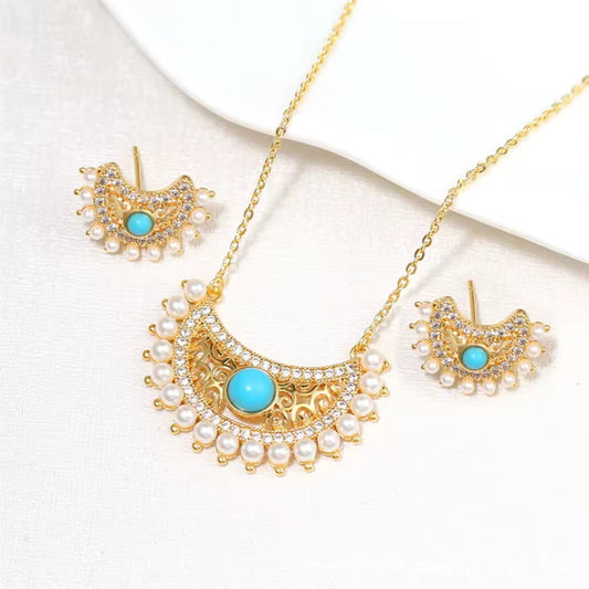 Retro Moon Crescent Turquoise and Diamond Pendant Necklace and Earrings Set
