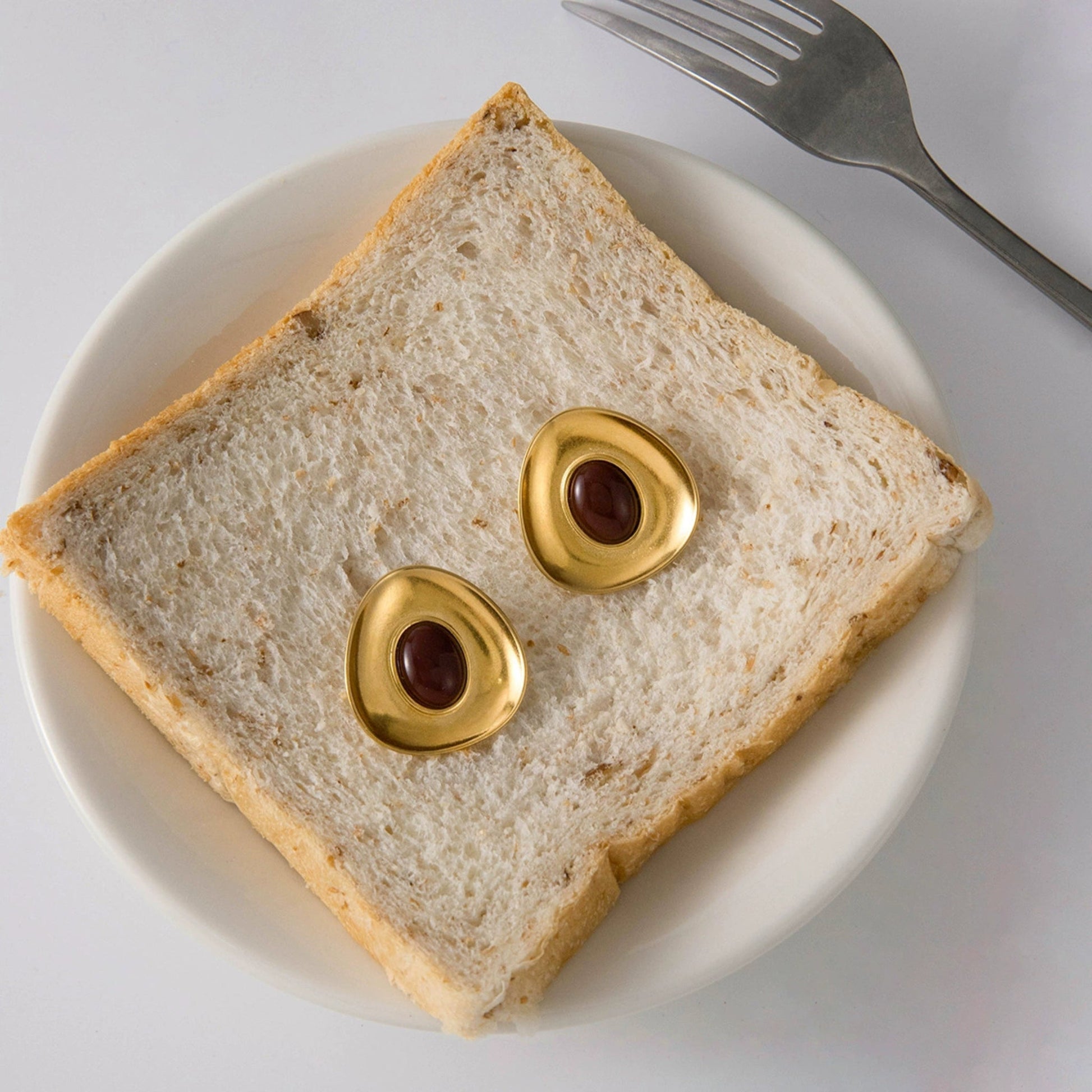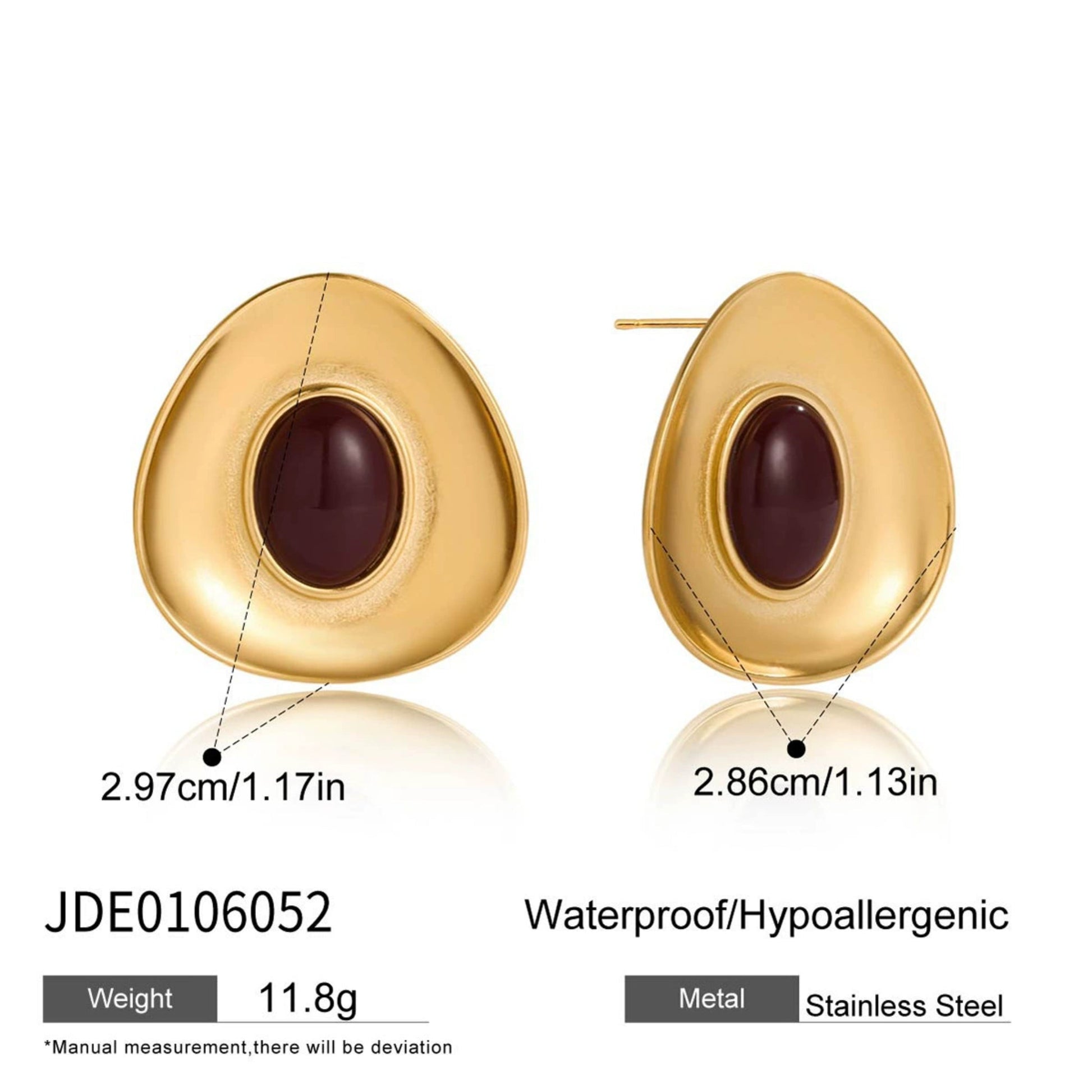 Make a bold fashion statement with the Gold Oval Statement Stud Earrings, a perfect fusion of modern artistry and timeless luxury. These earrings feature a sculpted teardrop shape with a smooth, glossy deep maroon stone center surrounded by a radiant 18K gold-plated frame, creating a rich contrast that exudes sophistication.