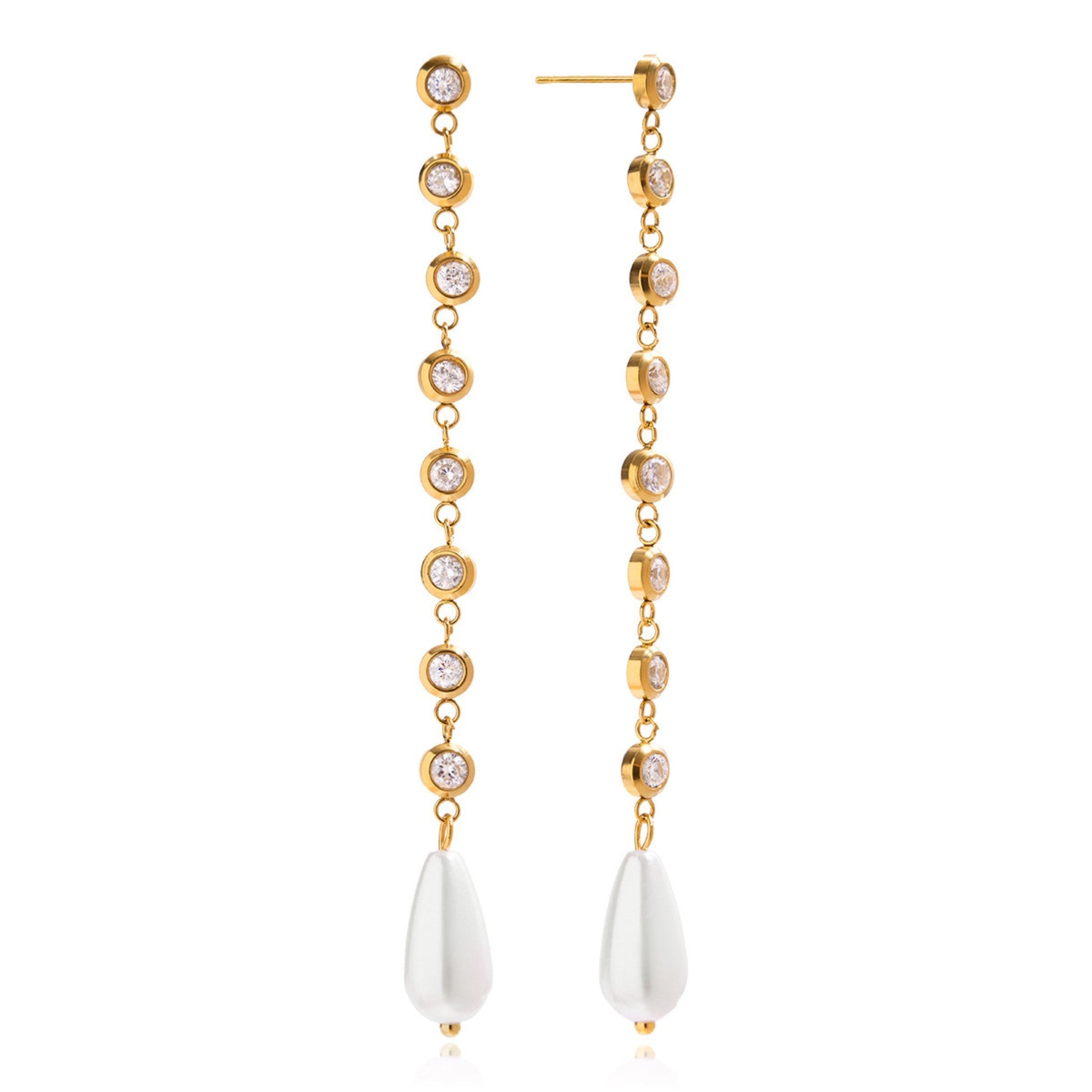 Designed with a slender gold-plated chain adorned with brilliant round-cut crystals and finished with a single teardrop pearl, these earrings create a luxurious, elongated silhouette perfect for day-to-night wear.